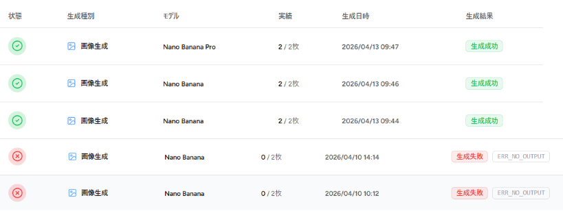 「成功」「一部成功(生成枚数不足など)」「失敗」それぞれ絞り込めます。